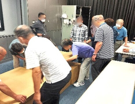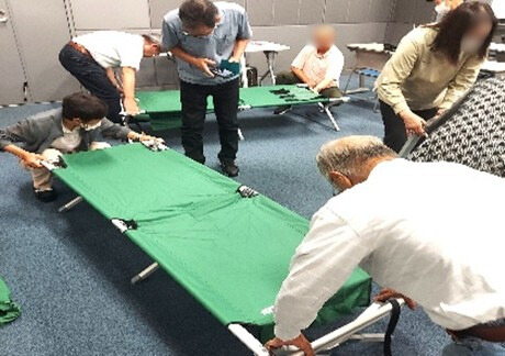・段ボールベッドの組立を全員で行いました。こちらは組み立てる時間がかかり、寝心地も固いので皆さんからは不評でした。 収納箱に戻す時も順序良く入れないと入りきらず時間がかかるのでこの点も不評でした。